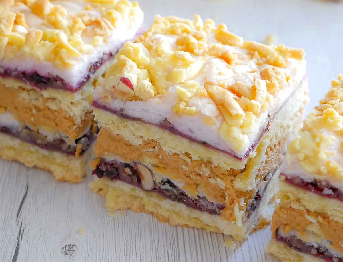 Ciasto Hucułka to tradycyjne, wielowarstwowe ciasto składające się z kruchego spodu, puszystej bezy i kremowego kajmaku. Ten wyjątkowy wypiek charakteryzuje się połączeniem trzech różnych faktur i smaków, co czyni go idealnym wyborem na rodzinne uroczystości i święta.